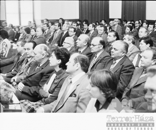 AZONOSÍTÓ: THM-BJ-00716a A rendezvény résztvevői. [A szocialista brigádmozgalom szovjet mintára az 1950-es évek végén kezdett kibontakozni Magyarországon, és rendszerváltoztatáskor szűnt meg. Kezdetben csak az ipari üzemekben és gyárakban alakultak meg a brigádok, majd az agráriumban és a hivatali szférában is létrejöttek. A mozgalom jelszava: „Szocialista módon dolgozni, tanulni és élni” volt.] HELYSZÍN: Szekszárd, Tolna megye DÁTUM: 1977 FOTÓS: Bakó Jenő