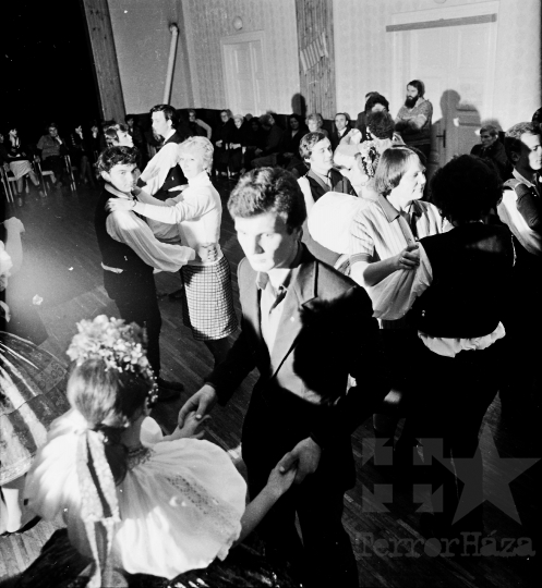 AZONOSÍTÓ: THM-BJ-00718 Néptánc produkció a színpadon - transzparenseken feliratok: "Hatékonyabb munkával a XI. pártkongresszus határozatainak következetes végrehajtásáért" "Munkánk minőségének és hatékonyságának javításával, többletvállalásokkal készülünk a NAGY OKT. SZOC. FORR. 60. évfordulójára". [Az októberi orosz forradalom (kommunista propagandában: nagy októberi szocialista forradalom) 1917. november 6–12. (október 24–30.) között zajlott, amelynek során a bolsevikok a Téli Palota ostroma után az ott székelő Ideiglenes Kormány tagjait letartóztatták, és Lenin vezetésével, akit a Népbiztosok Tanácsa elnökévé választottak, puccsal átvették a hatalmat. Hazánkban ez a nap 1950-től 1989-ig pártállami ünnep volt.] [A szocialista brigádmozgalom szovjet mintára az 1950-es évek végén kezdett kibontakozni Magyarországon, és rendszerváltoztatáskor szűnt meg. Kezdetben csak az ipari üzemekben és gyárakban alakultak meg a brigádok, majd az agráriumban és a hivatali szférában is létrejöttek. A mozgalom jelszava: „Szocialista módon dolgozni, tanulni és élni” volt.] HELYSZÍN: Szekszárd, Tolna megye DÁTUM: 1977 FOTÓS: Bakó Jenő