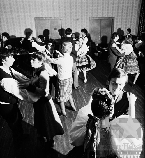 AZONOSÍTÓ: THM-BJ-00718 Néptánc produkció a színpadon - transzparenseken feliratok: "Hatékonyabb munkával a XI. pártkongresszus határozatainak következetes végrehajtásáért" "Munkánk minőségének és hatékonyságának javításával, többletvállalásokkal készülünk a NAGY OKT. SZOC. FORR. 60. évfordulójára". [Az októberi orosz forradalom (kommunista propagandában: nagy októberi szocialista forradalom) 1917. november 6–12. (október 24–30.) között zajlott, amelynek során a bolsevikok a Téli Palota ostroma után az ott székelő Ideiglenes Kormány tagjait letartóztatták, és Lenin vezetésével, akit a Népbiztosok Tanácsa elnökévé választottak, puccsal átvették a hatalmat. Hazánkban ez a nap 1950-től 1989-ig pártállami ünnep volt.] [A szocialista brigádmozgalom szovjet mintára az 1950-es évek végén kezdett kibontakozni Magyarországon, és rendszerváltoztatáskor szűnt meg. Kezdetben csak az ipari üzemekben és gyárakban alakultak meg a brigádok, majd az agráriumban és a hivatali szférában is létrejöttek. A mozgalom jelszava: „Szocialista módon dolgozni, tanulni és élni” volt.] HELYSZÍN: Szekszárd, Tolna megye DÁTUM: 1977 FOTÓS: Bakó Jenő