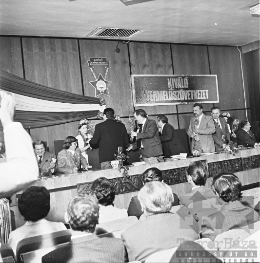 termelőszövetkezet kiváló szövetkezet beszéd pódium transzparens vörös csillag Kádár-címer Dombóvár Tolna megye Magyarország 1979 Bakó JenőFotó részletei