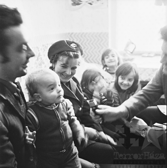 újságíró mikrofon gyerek csecsemő MÁV-jelvény család Mórágy Tolna megye Magyarország 1977 Bakó JenőFotó részletei