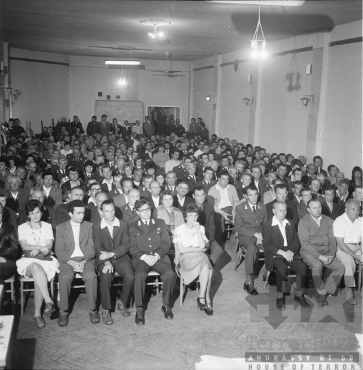 AZONOSÍTÓ: THM-BJ-00715 A rendezvény résztvevői. [A szocialista brigádmozgalom szovjet mintára az 1950-es évek végén kezdett kibontakozni Magyarországon, és rendszerváltoztatáskor szűnt meg. Kezdetben csak az ipari üzemekben és gyárakban alakultak meg a brigádok, majd az agráriumban és a hivatali szférában is létrejöttek. A mozgalom jelszava: „Szocialista módon dolgozni, tanulni és élni” volt.] HELYSZÍN: Szekszárd, Tolna megye DÁTUM: 1977 FOTÓS: Bakó Jenő