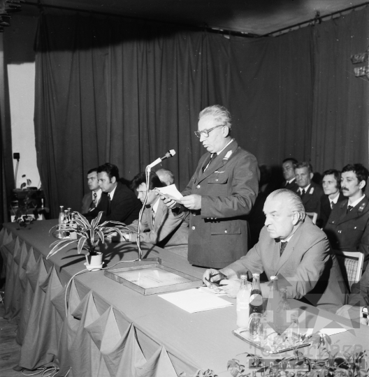 AZONOSÍTÓ: THM-BJ-00714 Férfi beszédet mond. [A szocialista brigádmozgalom szovjet mintára az 1950-es évek végén kezdett kibontakozni Magyarországon, és rendszerváltoztatáskor szűnt meg. Kezdetben csak az ipari üzemekben és gyárakban alakultak meg a brigádok, majd az agráriumban és a hivatali szférában is létrejöttek. A mozgalom jelszava: „Szocialista módon dolgozni, tanulni és élni” volt.] HELYSZÍN: Szekszárd, Tolna megye DÁTUM: 1977 FOTÓS: Bakó Jenő