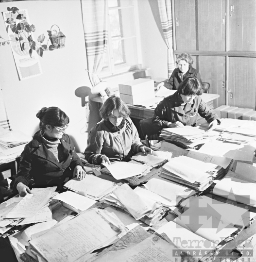 levéltáros irat köpeny okmány virág plakát akta szekrény munkahelyi élet Szekszárd Tolna megye 1979 Bakó Jenő MagyarországFotó részletei