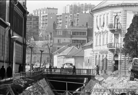 utcakép építkezés utcakép ZiL teherautó meder KRESZ-tábla Szekszárd Tolna megye Magyarország 1980 Bakó JenőFotó részletei