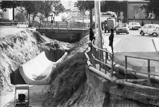 utcakép építkezés utcakép híd autó meder csatornázás Lada Skoda Szekszárd Tolna megye Magyarország 1980 Bakó JenőFotó részletei