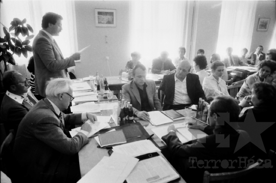 AZONOSÍTÓ: THM-BJ-00717 Férfi beszédet mond - transzparensen felirat: "Munkánk minőségének és hatékonyságának javításával, többletvállalásokkal készülünk a NAGY OKT. SZOC. FORR. 60. évfordulójára". [Az októberi orosz forradalom (kommunista propagandában: nagy októberi szocialista forradalom) 1917. november 6–12. (október 24–30.) között zajlott, amelynek során a bolsevikok a Téli Palota ostroma után az ott székelő Ideiglenes Kormány tagjait letartóztatták, és Lenin vezetésével, akit a Népbiztosok Tanácsa elnökévé választottak, puccsal átvették a hatalmat. Hazánkban ez a nap 1950-től 1989-ig pártállami ünnep volt.] [A szocialista brigádmozgalom szovjet mintára az 1950-es évek végén kezdett kibontakozni Magyarországon, és rendszerváltoztatáskor szűnt meg. Kezdetben csak az ipari üzemekben és gyárakban alakultak meg a brigádok, majd az agráriumban és a hivatali szférában is létrejöttek. A mozgalom jelszava: „Szocialista módon dolgozni, tanulni és élni” volt.] HELYSZÍN: Szekszárd, Tolna megye DÁTUM: 1977 FOTÓS: Bakó Jenő
