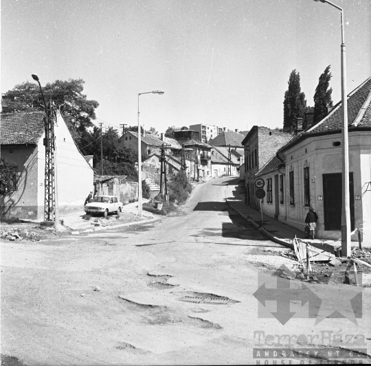 utcakép autó építőipar szanálás bontás KRESZ-tábla Szekszárd Tolna megye Magyarország 1982 Bakó JenőFotó részletei
