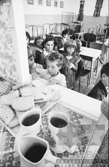 általános iskola napközi diák iskola uzsonna ebédlő kancsó kenyér Mórágy Tolna megye Magyarország 1984 Bakó JenőFotó részletei