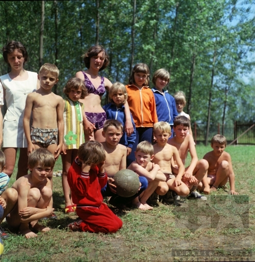 nyaralás nyár üdülés fürdőruha gyerek labda csoportkép melegítő Fadd-Dombori Tolna megye Magyarország 1975 Bakó JenőFotó részletei