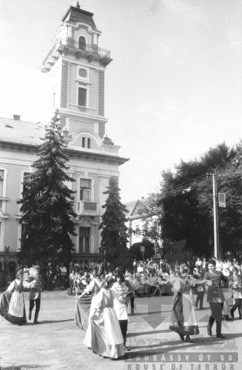 AZONOSÍTÓ: THM-BJ-00718 Néptánc produkció a színpadon - transzparenseken feliratok: "Hatékonyabb munkával a XI. pártkongresszus határozatainak következetes végrehajtásáért" "Munkánk minőségének és hatékonyságának javításával, többletvállalásokkal készülünk a NAGY OKT. SZOC. FORR. 60. évfordulójára". [Az októberi orosz forradalom (kommunista propagandában: nagy októberi szocialista forradalom) 1917. november 6–12. (október 24–30.) között zajlott, amelynek során a bolsevikok a Téli Palota ostroma után az ott székelő Ideiglenes Kormány tagjait letartóztatták, és Lenin vezetésével, akit a Népbiztosok Tanácsa elnökévé választottak, puccsal átvették a hatalmat. Hazánkban ez a nap 1950-től 1989-ig pártállami ünnep volt.] [A szocialista brigádmozgalom szovjet mintára az 1950-es évek végén kezdett kibontakozni Magyarországon, és rendszerváltoztatáskor szűnt meg. Kezdetben csak az ipari üzemekben és gyárakban alakultak meg a brigádok, majd az agráriumban és a hivatali szférában is létrejöttek. A mozgalom jelszava: „Szocialista módon dolgozni, tanulni és élni” volt.] HELYSZÍN: Szekszárd, Tolna megye DÁTUM: 1977 FOTÓS: Bakó Jenő
