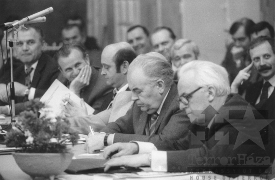 Havasi Ferenc, az MSZMP Politikai Bizottság tagja a pódiumon, mellette a szemüveges férfi K. Papp József, a Tolna megyei pártbizottság első titkára.