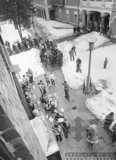 AZONOSÍTÓ: THM-BJ-00740 Zenészek asztal mellett játszanak. [TOTÉV: Tolna megyei Tatarozó és Építő Vállalat 1950. október végén a megyeszerte működő kisipari szövetkezetek összevonásával alakult meg, 1968 közepére szocialista középvállalattá nőtte ki magát Tm. Tanácsi Építőipari Vállalat néven.] HELYSZÍN: Szekszárd, Tolna megye DÁTUM: 1977 FOTÓS: Bakó Jenő