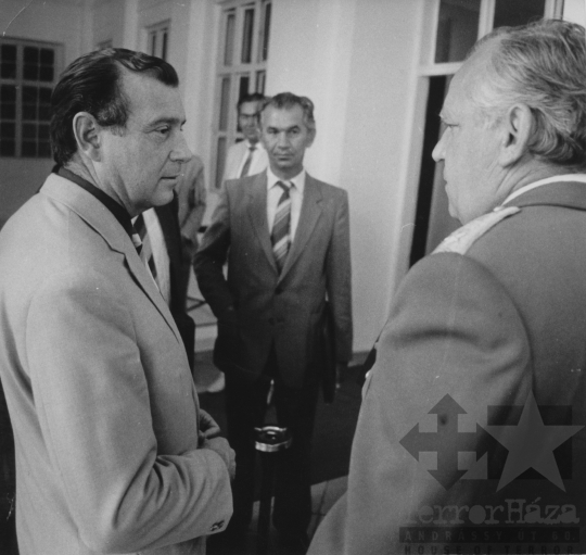 Férfiak beszélgetnek. Világos öltönyben Horváth István, belügyminiszter, középen hátrébb dr. Péter Szigfrid, a Tolna megyei Pártbizottság első titkára.