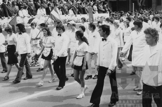 szocialista állami ünnep ifjúsági mozgalmi élet május 1. munka ünnepe felvonulás tribün utcakép Szekszárd Tolna megye Magyarország 1977 Bakó JenőFotó részletei