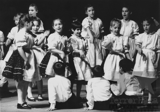 AZONOSÍTÓ: THM-BJ-00718 Néptánc produkció a színpadon - transzparenseken feliratok: "Hatékonyabb munkával a XI. pártkongresszus határozatainak következetes végrehajtásáért" "Munkánk minőségének és hatékonyságának javításával, többletvállalásokkal készülünk a NAGY OKT. SZOC. FORR. 60. évfordulójára". [Az októberi orosz forradalom (kommunista propagandában: nagy októberi szocialista forradalom) 1917. november 6–12. (október 24–30.) között zajlott, amelynek során a bolsevikok a Téli Palota ostroma után az ott székelő Ideiglenes Kormány tagjait letartóztatták, és Lenin vezetésével, akit a Népbiztosok Tanácsa elnökévé választottak, puccsal átvették a hatalmat. Hazánkban ez a nap 1950-től 1989-ig pártállami ünnep volt.] [A szocialista brigádmozgalom szovjet mintára az 1950-es évek végén kezdett kibontakozni Magyarországon, és rendszerváltoztatáskor szűnt meg. Kezdetben csak az ipari üzemekben és gyárakban alakultak meg a brigádok, majd az agráriumban és a hivatali szférában is létrejöttek. A mozgalom jelszava: „Szocialista módon dolgozni, tanulni és élni” volt.] HELYSZÍN: Szekszárd, Tolna megye DÁTUM: 1977 FOTÓS: Bakó Jenő