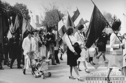 szocialista állami ünnep május 1. munka ünnepe felvonulás utcakép zászló Tamási Tolna megye Magyarország 1986 Bakó JenőFotó részletei