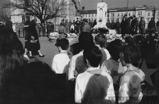 nemzeti ünnep március 15. koszorúzás koszorú Ifjú Gárda emlékmű ifjúsági mozgalmi élet utcakép úttörő egyenruha Szekszárd Tolna megye Magyarország 1968 Bakó JenőFotó részletei