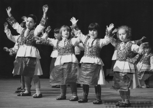 AZONOSÍTÓ: THM-BJ-00718 Néptánc produkció a színpadon - transzparenseken feliratok: "Hatékonyabb munkával a XI. pártkongresszus határozatainak következetes végrehajtásáért" "Munkánk minőségének és hatékonyságának javításával, többletvállalásokkal készülünk a NAGY OKT. SZOC. FORR. 60. évfordulójára". [Az októberi orosz forradalom (kommunista propagandában: nagy októberi szocialista forradalom) 1917. november 6–12. (október 24–30.) között zajlott, amelynek során a bolsevikok a Téli Palota ostroma után az ott székelő Ideiglenes Kormány tagjait letartóztatták, és Lenin vezetésével, akit a Népbiztosok Tanácsa elnökévé választottak, puccsal átvették a hatalmat. Hazánkban ez a nap 1950-től 1989-ig pártállami ünnep volt.] [A szocialista brigádmozgalom szovjet mintára az 1950-es évek végén kezdett kibontakozni Magyarországon, és rendszerváltoztatáskor szűnt meg. Kezdetben csak az ipari üzemekben és gyárakban alakultak meg a brigádok, majd az agráriumban és a hivatali szférában is létrejöttek. A mozgalom jelszava: „Szocialista módon dolgozni, tanulni és élni” volt.] HELYSZÍN: Szekszárd, Tolna megye DÁTUM: 1977 FOTÓS: Bakó Jenő