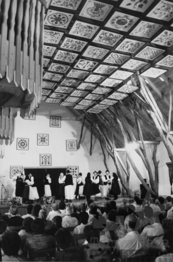 AZONOSÍTÓ: THM-BJ-00718 Néptánc produkció a színpadon - transzparenseken feliratok: "Hatékonyabb munkával a XI. pártkongresszus határozatainak következetes végrehajtásáért" "Munkánk minőségének és hatékonyságának javításával, többletvállalásokkal készülünk a NAGY OKT. SZOC. FORR. 60. évfordulójára". [Az októberi orosz forradalom (kommunista propagandában: nagy októberi szocialista forradalom) 1917. november 6–12. (október 24–30.) között zajlott, amelynek során a bolsevikok a Téli Palota ostroma után az ott székelő Ideiglenes Kormány tagjait letartóztatták, és Lenin vezetésével, akit a Népbiztosok Tanácsa elnökévé választottak, puccsal átvették a hatalmat. Hazánkban ez a nap 1950-től 1989-ig pártállami ünnep volt.] [A szocialista brigádmozgalom szovjet mintára az 1950-es évek végén kezdett kibontakozni Magyarországon, és rendszerváltoztatáskor szűnt meg. Kezdetben csak az ipari üzemekben és gyárakban alakultak meg a brigádok, majd az agráriumban és a hivatali szférában is létrejöttek. A mozgalom jelszava: „Szocialista módon dolgozni, tanulni és élni” volt.] HELYSZÍN: Szekszárd, Tolna megye DÁTUM: 1977 FOTÓS: Bakó Jenő