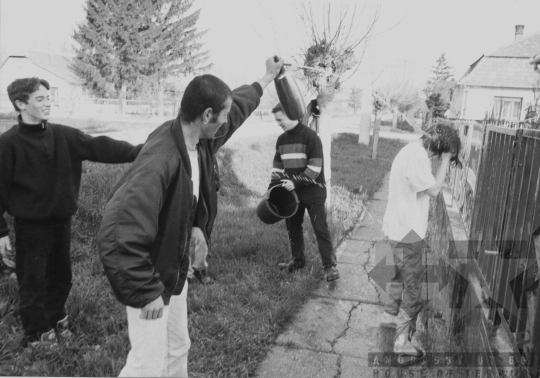 húsvét locsolkodás népszokás utcakép szódásszifon Decs Tolna megye Magyarország 1980 Bakó JenőFotó részletei