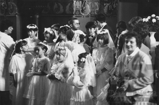 elsőáldozás templom gyerek ünneplő katolikus Sióagárd Tolna megye Magyarország 1980 Bakó JenőFotó részletei