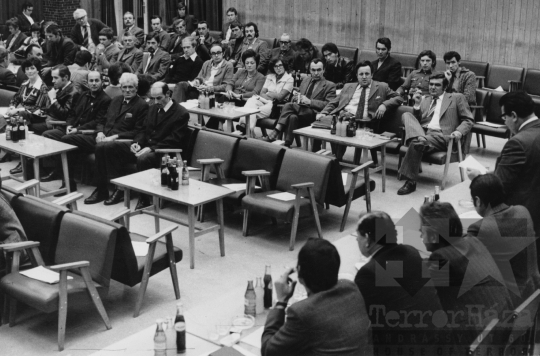 AZONOSÍTÓ: THM-BJ-00716a A rendezvény résztvevői. [A szocialista brigádmozgalom szovjet mintára az 1950-es évek végén kezdett kibontakozni Magyarországon, és rendszerváltoztatáskor szűnt meg. Kezdetben csak az ipari üzemekben és gyárakban alakultak meg a brigádok, majd az agráriumban és a hivatali szférában is létrejöttek. A mozgalom jelszava: „Szocialista módon dolgozni, tanulni és élni” volt.] HELYSZÍN: Szekszárd, Tolna megye DÁTUM: 1977 FOTÓS: Bakó Jenő