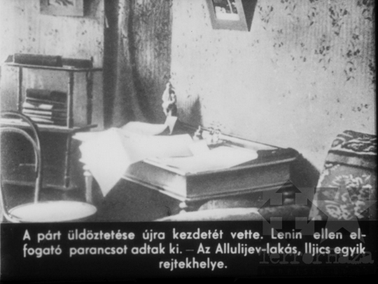 LEÍRÁS: A propagandafilm a bolsevizmus és a a szovjet állam alapítójának életét mutatja be fotókon és grafikákon keresztül.