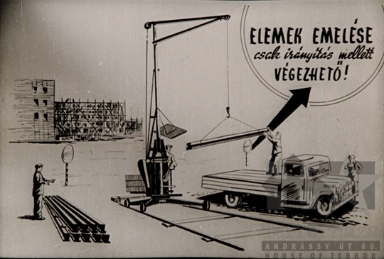 fekete-fehér diafilm oktatófilm propaganda agitáció munkavédelem építkezés teherautó daru acélgerenda grafikaFotó részletei