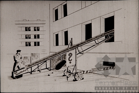 fekete-fehér diafilm oktatófilm propaganda agitáció munkavédelem építkezés szállítószalag grafikaFotó részletei