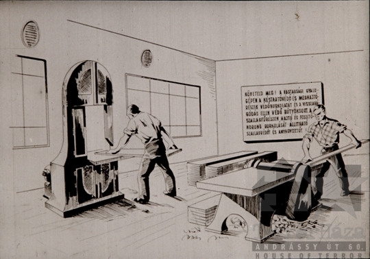 fekete-fehér diafilm oktatófilm propaganda agitáció munkavédelem fűrésztelep gyalupad deszka grafikaFotó részletei