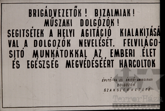 AZONOSÍTÓ: THM-BJ-00717 Férfi beszédet mond - transzparensen felirat: "Munkánk minőségének és hatékonyságának javításával, többletvállalásokkal készülünk a NAGY OKT. SZOC. FORR. 60. évfordulójára". [Az októberi orosz forradalom (kommunista propagandában: nagy októberi szocialista forradalom) 1917. november 6–12. (október 24–30.) között zajlott, amelynek során a bolsevikok a Téli Palota ostroma után az ott székelő Ideiglenes Kormány tagjait letartóztatták, és Lenin vezetésével, akit a Népbiztosok Tanácsa elnökévé választottak, puccsal átvették a hatalmat. Hazánkban ez a nap 1950-től 1989-ig pártállami ünnep volt.] [A szocialista brigádmozgalom szovjet mintára az 1950-es évek végén kezdett kibontakozni Magyarországon, és rendszerváltoztatáskor szűnt meg. Kezdetben csak az ipari üzemekben és gyárakban alakultak meg a brigádok, majd az agráriumban és a hivatali szférában is létrejöttek. A mozgalom jelszava: „Szocialista módon dolgozni, tanulni és élni” volt.] HELYSZÍN: Szekszárd, Tolna megye DÁTUM: 1977 FOTÓS: Bakó Jenő