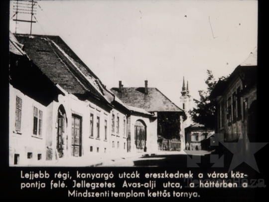 fekete-fehér diafilm ismeretterjesztő belváros várostörténet utcakép templom harangtorony Avas Miskolc 1963Fotó részletei