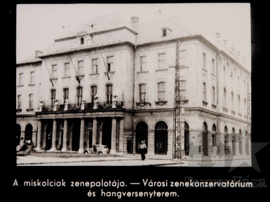 fekete-fehér diafilm ismeretterjesztő belváros konzervatórium hangversenyterem utcakép Miskolc 1963Fotó részletei