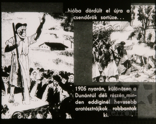 fekete-fehér diafilm propaganda földmunkás parasztmozgalom 1905 Dunántúl aratósztrájk 1963Fotó részletei