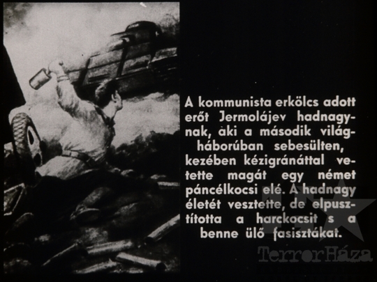 fekete-fehér diafilm propaganda ifjúsági mozgalmi élet KISZ kommunizmus Jermolájev hadnagy fasizmus világháború gránát 1962Fotó részletei