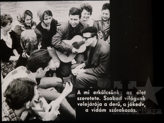 fekete-fehér diafilm propaganda ifjúsági mozgalmi élet KISZ erkölcs kommunizmus szocializmus ifjúság gitár kommunista erkölcs 1962Fotó részletei