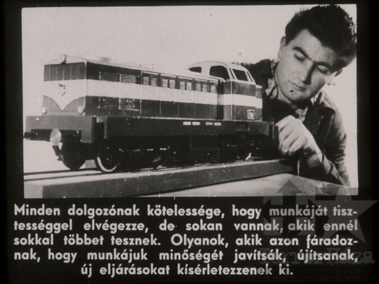 fekete-fehér diafilm propaganda ifjúsági mozgalmi élet KISZ munka makett mozdony 1962Fotó részletei