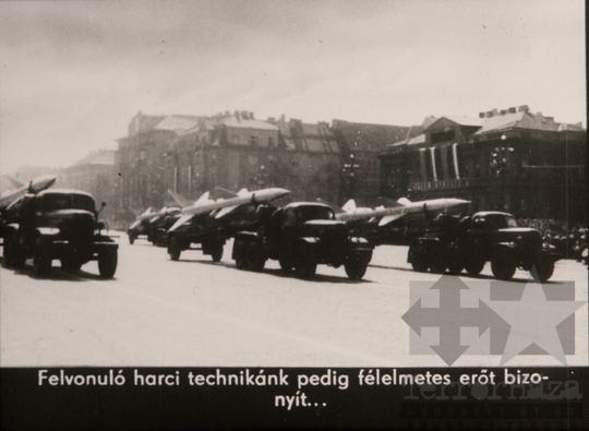fekete-fehér diafilm propaganda hidegháború katona néphadsereg haza április 4. díszszemle Csepel teherautó 1965Fotó részletei