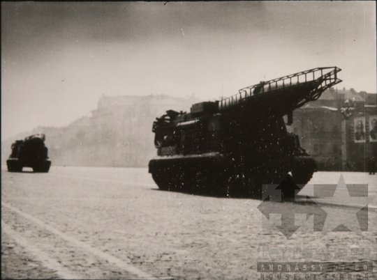 fekete-fehér diafilm propaganda hidegháború katona néphadsereg haza április 4. díszszemle harckocsi 1965Fotó részletei