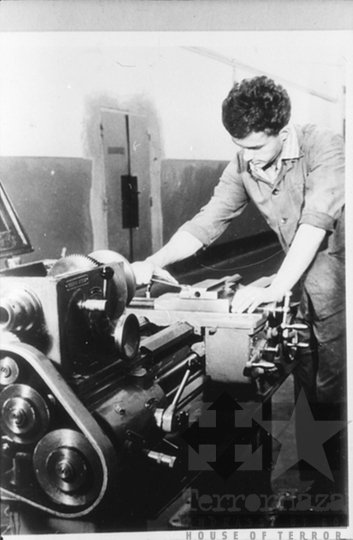 AZONOSÍTÓ: THM-BJ-00717 Férfi beszédet mond - transzparensen felirat: "Munkánk minőségének és hatékonyságának javításával, többletvállalásokkal készülünk a NAGY OKT. SZOC. FORR. 60. évfordulójára". [Az októberi orosz forradalom (kommunista propagandában: nagy októberi szocialista forradalom) 1917. november 6–12. (október 24–30.) között zajlott, amelynek során a bolsevikok a Téli Palota ostroma után az ott székelő Ideiglenes Kormány tagjait letartóztatták, és Lenin vezetésével, akit a Népbiztosok Tanácsa elnökévé választottak, puccsal átvették a hatalmat. Hazánkban ez a nap 1950-től 1989-ig pártállami ünnep volt.] [A szocialista brigádmozgalom szovjet mintára az 1950-es évek végén kezdett kibontakozni Magyarországon, és rendszerváltoztatáskor szűnt meg. Kezdetben csak az ipari üzemekben és gyárakban alakultak meg a brigádok, majd az agráriumban és a hivatali szférában is létrejöttek. A mozgalom jelszava: „Szocialista módon dolgozni, tanulni és élni” volt.] HELYSZÍN: Szekszárd, Tolna megye DÁTUM: 1977 FOTÓS: Bakó Jenő