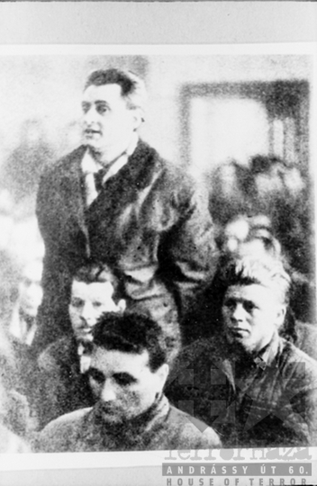 AZONOSÍTÓ: THM-BJ-00717 Férfi beszédet mond - transzparensen felirat: "Munkánk minőségének és hatékonyságának javításával, többletvállalásokkal készülünk a NAGY OKT. SZOC. FORR. 60. évfordulójára". [Az októberi orosz forradalom (kommunista propagandában: nagy októberi szocialista forradalom) 1917. november 6–12. (október 24–30.) között zajlott, amelynek során a bolsevikok a Téli Palota ostroma után az ott székelő Ideiglenes Kormány tagjait letartóztatták, és Lenin vezetésével, akit a Népbiztosok Tanácsa elnökévé választottak, puccsal átvették a hatalmat. Hazánkban ez a nap 1950-től 1989-ig pártállami ünnep volt.] [A szocialista brigádmozgalom szovjet mintára az 1950-es évek végén kezdett kibontakozni Magyarországon, és rendszerváltoztatáskor szűnt meg. Kezdetben csak az ipari üzemekben és gyárakban alakultak meg a brigádok, majd az agráriumban és a hivatali szférában is létrejöttek. A mozgalom jelszava: „Szocialista módon dolgozni, tanulni és élni” volt.] HELYSZÍN: Szekszárd, Tolna megye DÁTUM: 1977 FOTÓS: Bakó Jenő