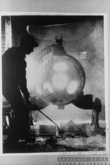 AZONOSÍTÓ: THM-BJ-00717 Férfi beszédet mond - transzparensen felirat: "Munkánk minőségének és hatékonyságának javításával, többletvállalásokkal készülünk a NAGY OKT. SZOC. FORR. 60. évfordulójára". [Az októberi orosz forradalom (kommunista propagandában: nagy októberi szocialista forradalom) 1917. november 6–12. (október 24–30.) között zajlott, amelynek során a bolsevikok a Téli Palota ostroma után az ott székelő Ideiglenes Kormány tagjait letartóztatták, és Lenin vezetésével, akit a Népbiztosok Tanácsa elnökévé választottak, puccsal átvették a hatalmat. Hazánkban ez a nap 1950-től 1989-ig pártállami ünnep volt.] [A szocialista brigádmozgalom szovjet mintára az 1950-es évek végén kezdett kibontakozni Magyarországon, és rendszerváltoztatáskor szűnt meg. Kezdetben csak az ipari üzemekben és gyárakban alakultak meg a brigádok, majd az agráriumban és a hivatali szférában is létrejöttek. A mozgalom jelszava: „Szocialista módon dolgozni, tanulni és élni” volt.] HELYSZÍN: Szekszárd, Tolna megye DÁTUM: 1977 FOTÓS: Bakó Jenő