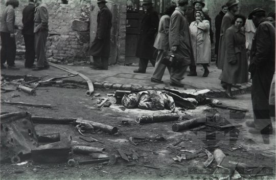 Szovjet katona mésszel leöntött holtteste a Práter utca és Futó utca sarkán.
