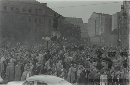 Tüntetés a Bem-szobornál. Háttérben a Radetzky laktanya. A kép előterében egy GAZ-M20 Pobeda részlete.