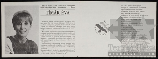 1990-es országgyűlési választás szórólapja. "Üzenjen a szabad jövőnek! Küldjön Szabad Demokratákat a parlamentbe!" Tímár Éva, az SZDSZ miskolci jelöltje.