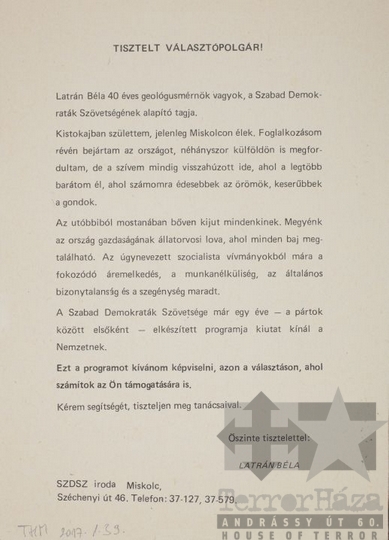 1990-es országgyűlési választás szórólapja. Latrán Béla, az SZDSZ miskolci jelöltje.