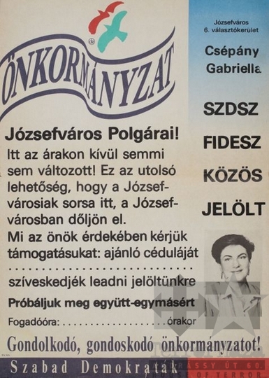 SZDSZ Szabad Demokraták Szövetsége Fidesz Fiatal Demokraták Szövetsége választás helyhatósági választás önkormányzat szavazás plakát Csépány Gabriella jelölt Józsefváros Budapest 1990
