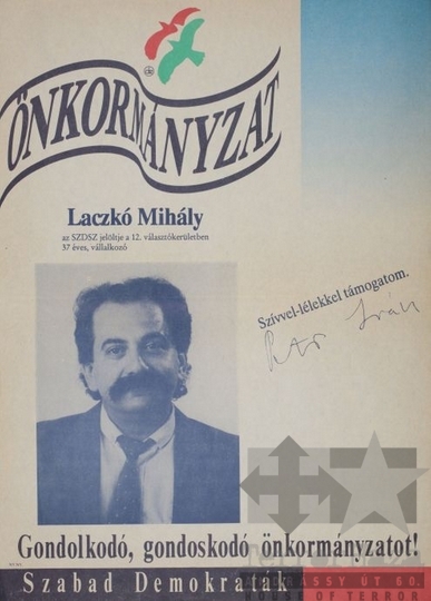 SZDSZ Szabad Demokraták Szövetsége Fidesz Fiatal Demokraták Szövetsége választás helyhatósági választás önkormányzat szavazás plakát Laczkó Mihály jelölt Újpest Budapest 1990