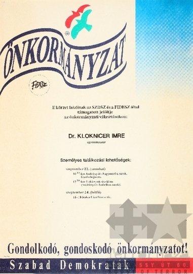 SZDSZ Szabad Demokraták Szövetsége Fidesz Fiatal Demokraták Szövetsége választás helyhatósági választás önkormányzat szavazás plakát dr. Kloknicer Imre jelölt Budapest 1990